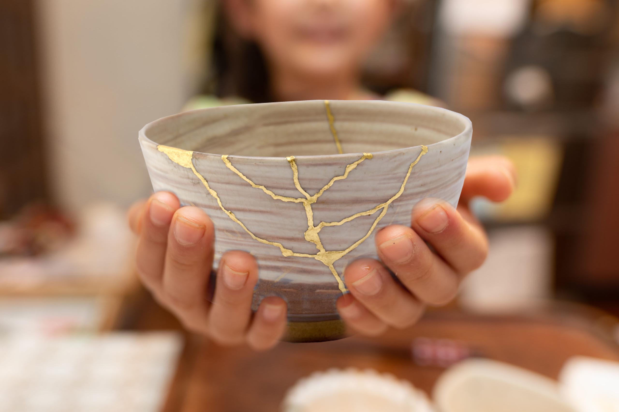 Kintsugi, čo znamená „zlatá oprava“, je japonské umenie dávať zlomené kúsky keramiky späť do nových diel. Rozbité poháre, hrnčeky, misky a taniere sú opravené do nádherne majstrovských diel pomocou zmesi práškového zlata a laku. Kintsugi je tradícia, ktorá je založená na viere, že rozbitie a nedokonalosti sú súčasťou života a že to, čo je rozbité, sa dá opraviť v niečo jedinečne krásne, ak sa s nimi zaobchádza s láskou, starostlivosťou a pozornosťou. Pre Japoncov to má ďaleko väčší význam – zafixovanie rozbitých predmetov – a oslava ich jedinečnosti – môže tiež pomôcť pri hojení rán samého seba.