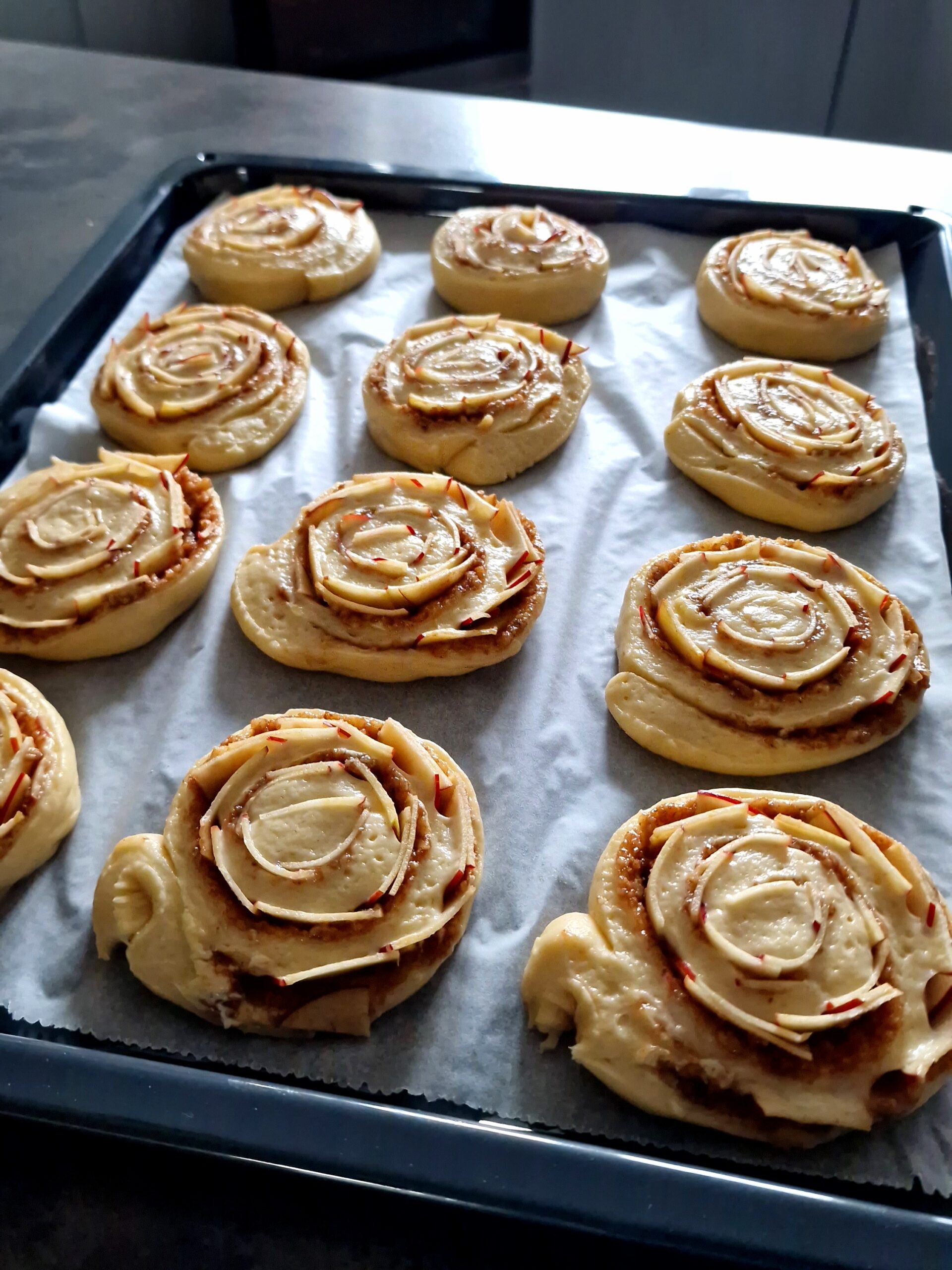 - Jablkové plátky nahusto poukladáme na cesto, zrolujeme ho a pokrájame na asi 3 cm široké kolieska.