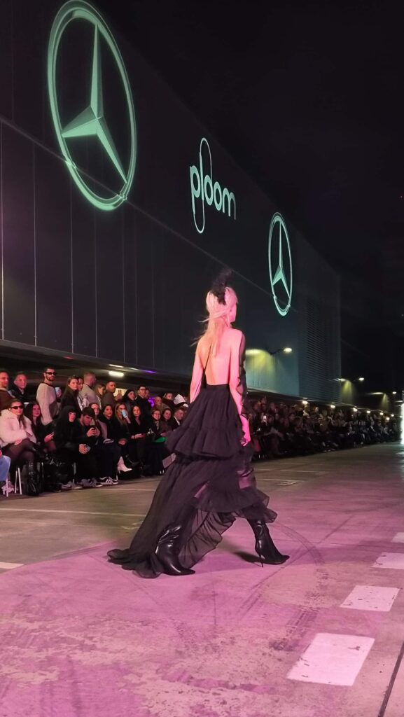 Úvodný večer dvanásteho ročníka Mercedes-Benz Fashion Live! priniesol silný zážitok z módy aj atmosféry. Pavol Dendis v spolupráci so značkou Ploom predstavil svoju kolekciu Romantic Rave vo vonkajších garážach bratislavského Nivy centra. Industriálne prostredie s ostrými líniami betónu a tlmeným svetlom kontrastovalo s poetikou kolekcie a stalo sa symbolickou kulisou pre stret jemnosti a energie.