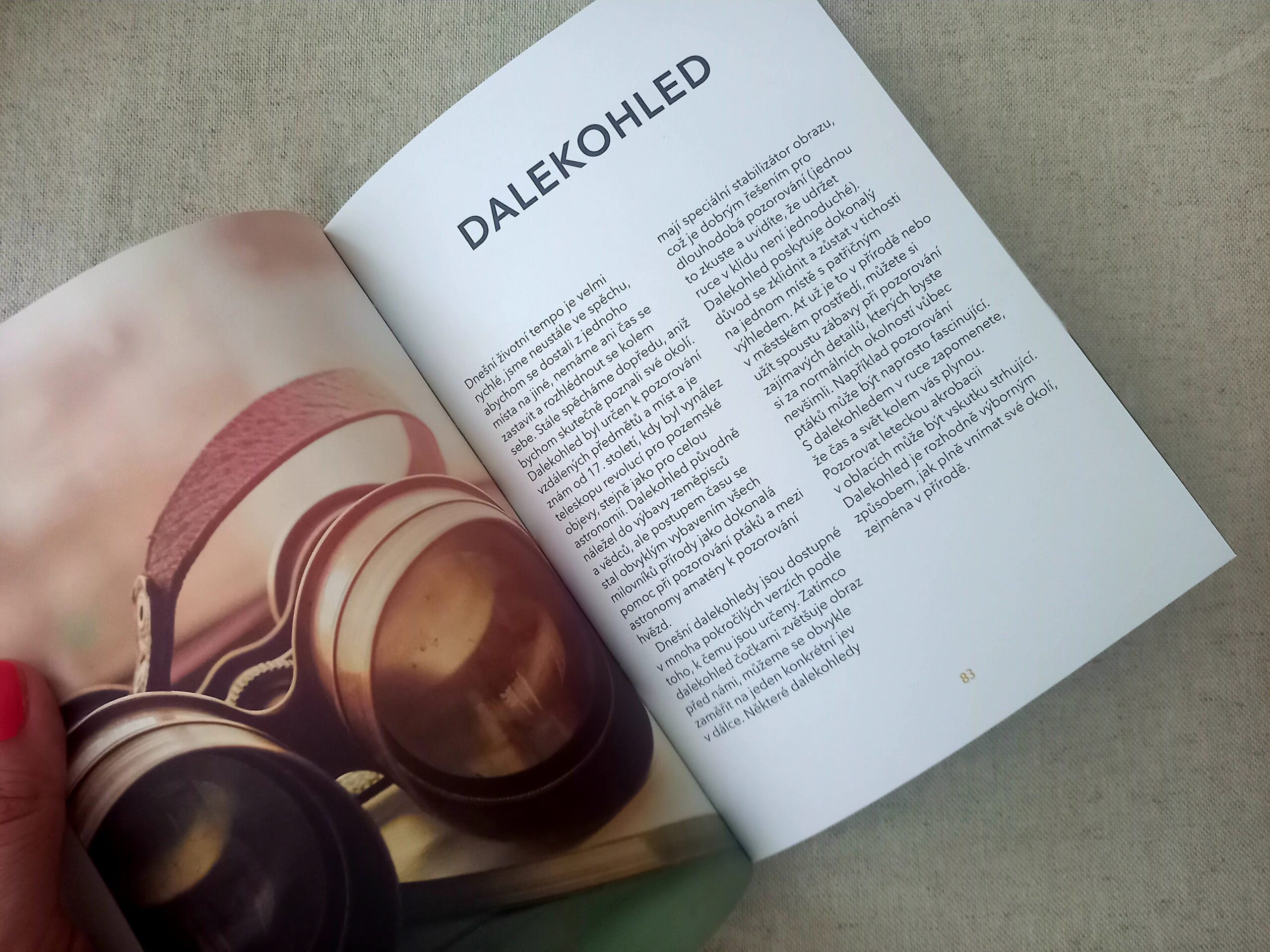 K jednotlivým predmetom nájdete vždy zaujímavý text. V úvode sa buď dozviete nejakú zaujímavosť alebo sa vrátite spomienkami do detstva. Následne sa v texte o danom predmete dočítate, akým spôsobom ho využívať tak, aby sme si to jednoducho v živote užívali a viac uvedomovali obyčajné chvíle. Pre predstavu, takouto formou je kniha písaná: